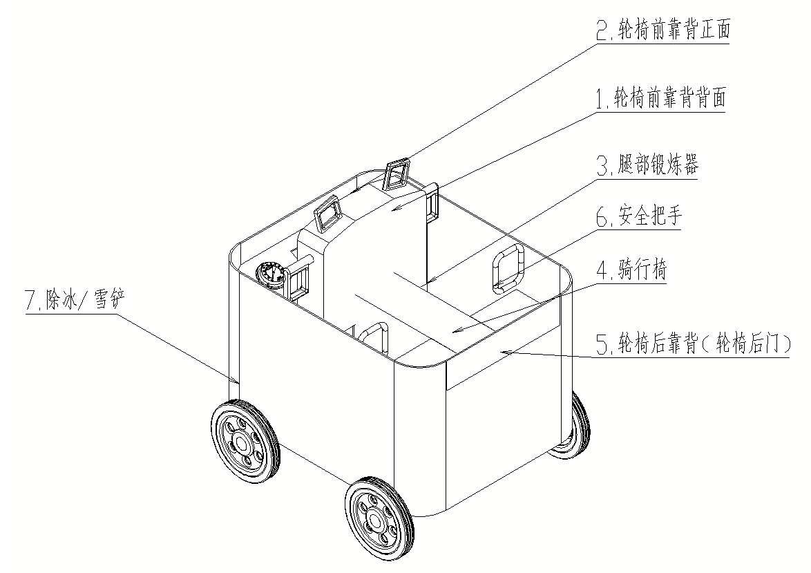 项目概要:设计思路:本人借鉴日本rodem轮椅机器人、全封闭单人电动车等外形,设计了一种基于电动轮椅的可骑行康复轮椅机器人。 背景:我国各类残疾人8500万,通过人工及现有的助残设备已不能满足患者的要求。现在的轮椅绝大多数需要家人推行或陪伴,对于脑卒中患者患者后续康复周期长,占用大量的时间、人力成本,如果康复不及时、不到位,患者可能发生二次卒中,严重影响其生活质量。传统的康复器材占地面积大,不适合搬运;传统的轮椅无论是电动轮椅还是普通轮椅对于脑卒中患者使用不够安全和智能。 创新点: 1.可骑行康复轮椅改变人们对轮椅的外观认知,使用者乘坐不容易被定义为残障人士。 2.以前进的方式进入轮椅,方便从床与轮椅之间的方便移乘。 3.功能上满足最基础的代步出行、脑卒中患者锻炼与康复需求。 作用:提出了一种可供脑卒中肌力三级以上人群使用的可骑行康复轮椅,属于二类医疗器械,可以实现康复、代步、安全防护的功能。脑卒中人群能在最佳的康复时间进行锻炼,避免因锻炼不及时造成肢体活动不便影响个人及家庭生活,避免再次卒中引起的二次伤害。 简要过程:本款轮椅可以实现:从卧床起身到移动至轮椅;自主操控轮椅;室内康复锻炼;室外出行代步等功能。具体包括:前后座椅靠背、可折叠座椅、手臂伸拉器、按摩脚蹬、安全助力把手、等半封闭的轮椅结构。兼具身体锻炼与康复的功能(轮椅的前部有肢体锻炼的设施,使用者在轮椅当中可以进行坐位或者站立的上、下肢的主动锻炼及被动康复)。 社会效益与经济效益::本发明打破人们对于轮椅是残疾人才能使用的固有认知,使残障人士更有尊严及体面;在保证安全的出行同时实现肢体主动锻炼与被动康复;轮椅可方便使用者由床到轮椅、室内到室外的独立操作,减少家庭和社会照护压力,促进残疾人士融入社会。通过提升康复效果,降低长期护理成本,减少医疗资源消耗,推动医疗器械行业创新,创造新的市场需求,带动相关产业链。 操作方法:1.使用者采用前进的方式进入轮椅,方便从床到轮椅及轮椅到床的安全、独立移乘。 2.轮椅两侧有安全把手,可以辅助使用者起身并缓慢移至轮椅上。 3.半封闭的结构(使用者胸部以下置于轮椅中,即使上下坡、侧身取物都不会有从轮椅中翻出的危险)。 4.当人在床上移行到轮椅上时,后车门向右侧折叠,人拽着安全把手可以起身到轮椅上,顺着直条形的座椅缓慢移动到轮椅前方,如果感觉疲劳,直条形座椅后半部分两侧的座椅椅翼升起,人向后靠,如同坐在沙发上舒适(座椅为折叠椅翼磁性式 ) 5.轮椅的座椅上下折叠,上观形状如飞机,放下就是骑行模式;升起就是座椅模式。 6.座椅位于轮椅中间靠后,前面的靠背固定于直条座椅最前端。前靠背与轮椅前脸有30厘米左右的距离,是放腿和脚的空间。 7.此款康复轮椅可以进行室内的康复锻炼。在前靠背上带有连杆可以上下移动,侧面的连杆可以左右伸缩,连杆的伸缩移动可以带动上肢进行主动及被动的锻炼,手持后可以上下、左右拉伸,锻炼上肢的大关节;轮椅前靠背的左右侧(大约相当于人坐位时腹部位置)有一副手套,连接电源可以进行手指的按摩,长期锻炼可避免肌肉萎缩;轮椅放置脚的位置前内侧有可折叠的脚蹬。