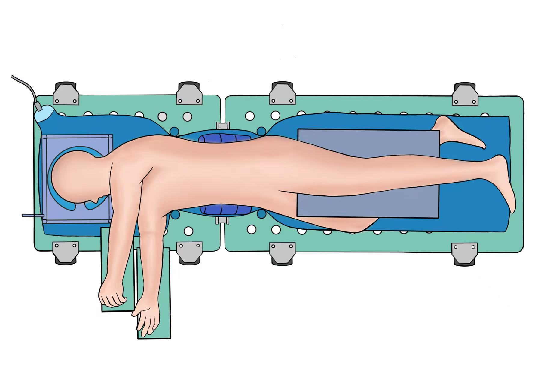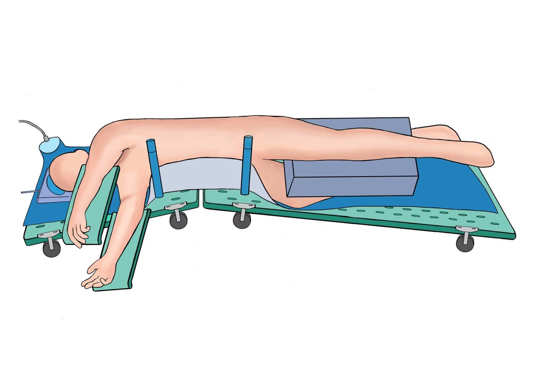 操作方法:手术开始前将折叠孔洞底板安装于手术床。患者完成气管插管全身麻醉并核对手术部位无误后,将其置于健侧卧位(手术侧朝上)。立即于腋下距肩峰处放置分子凝胶垫,支撑腰部术野。随后,根据手术术野需求,在患者肩胛部前方(近胸骨侧)与后方(近脊柱侧)、髋部前方(髂前上棘区域)与后方(骶髂关节区域),将分体式可调固定柱插入底板相应孔洞;并依据患者体型在关键支撑区域增置可拆卸固定柱以增强整体稳定性;通过调节固定柱高度与角度使患者身体形成所需手术体位。安放固定柱的核心原则是:必须选择远离计划手术切口的孔洞——此举有效避免了传统金属固定器需按压下腹部导致脏器,膈肌上移的问题,同时确保装置完全避让手术区域,为术者提供无遮挡操作空间。最后,麻醉师使用电动充气泵调节U型充气头圈,精确调整患者头部至合适高度。