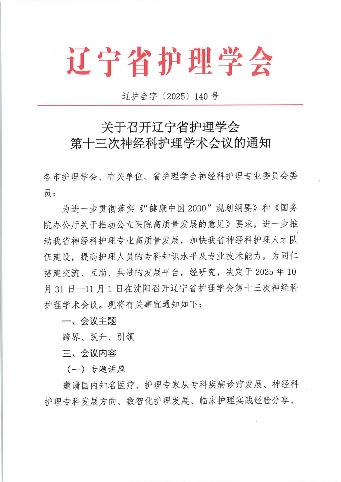 关于召开辽宁省护理学会第十三次神经科护理学术会议的通知