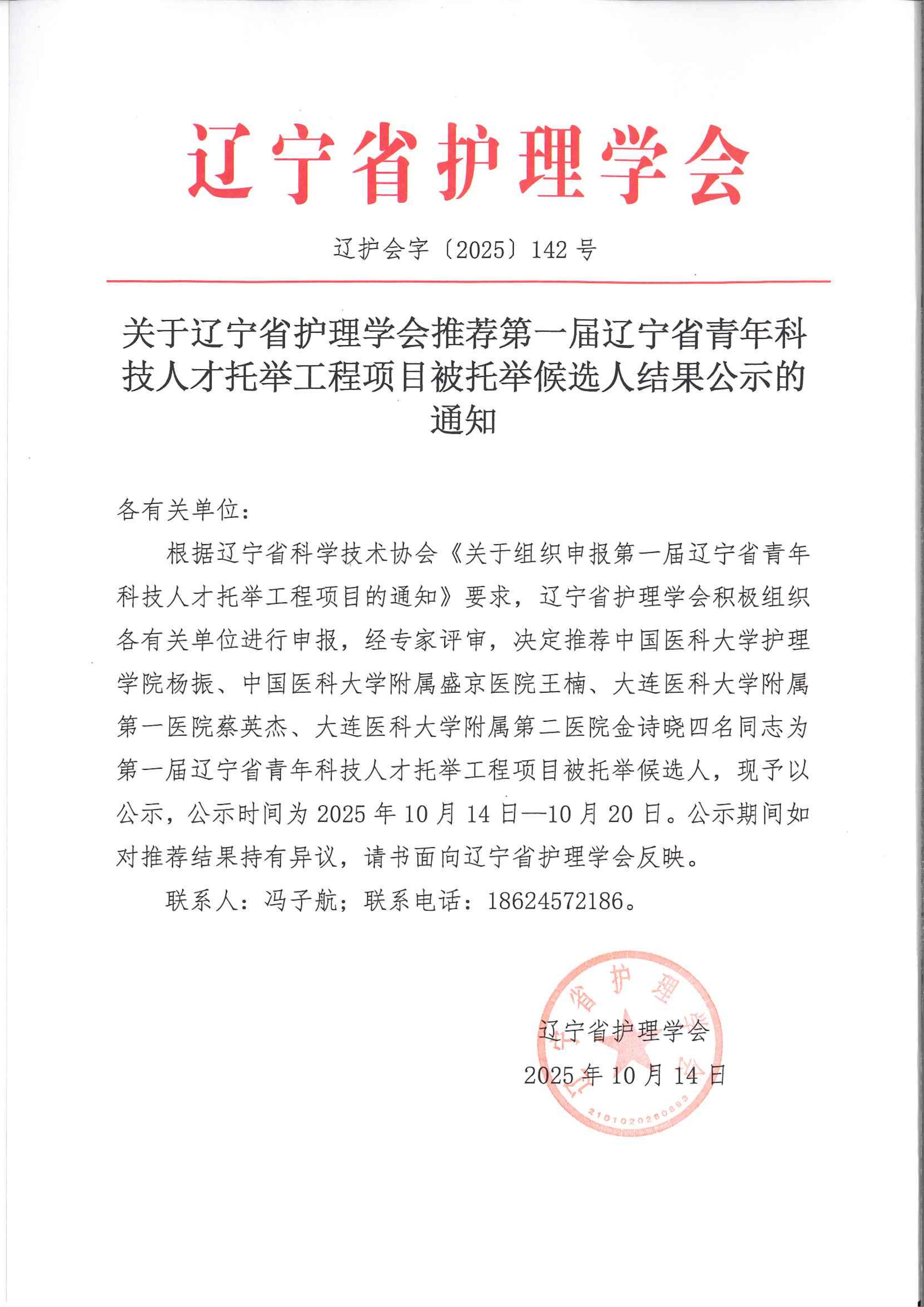 关于辽宁省护理学会推荐第一届辽宁省青年科技人才托举工程项目被托举候选人结果公示的通知