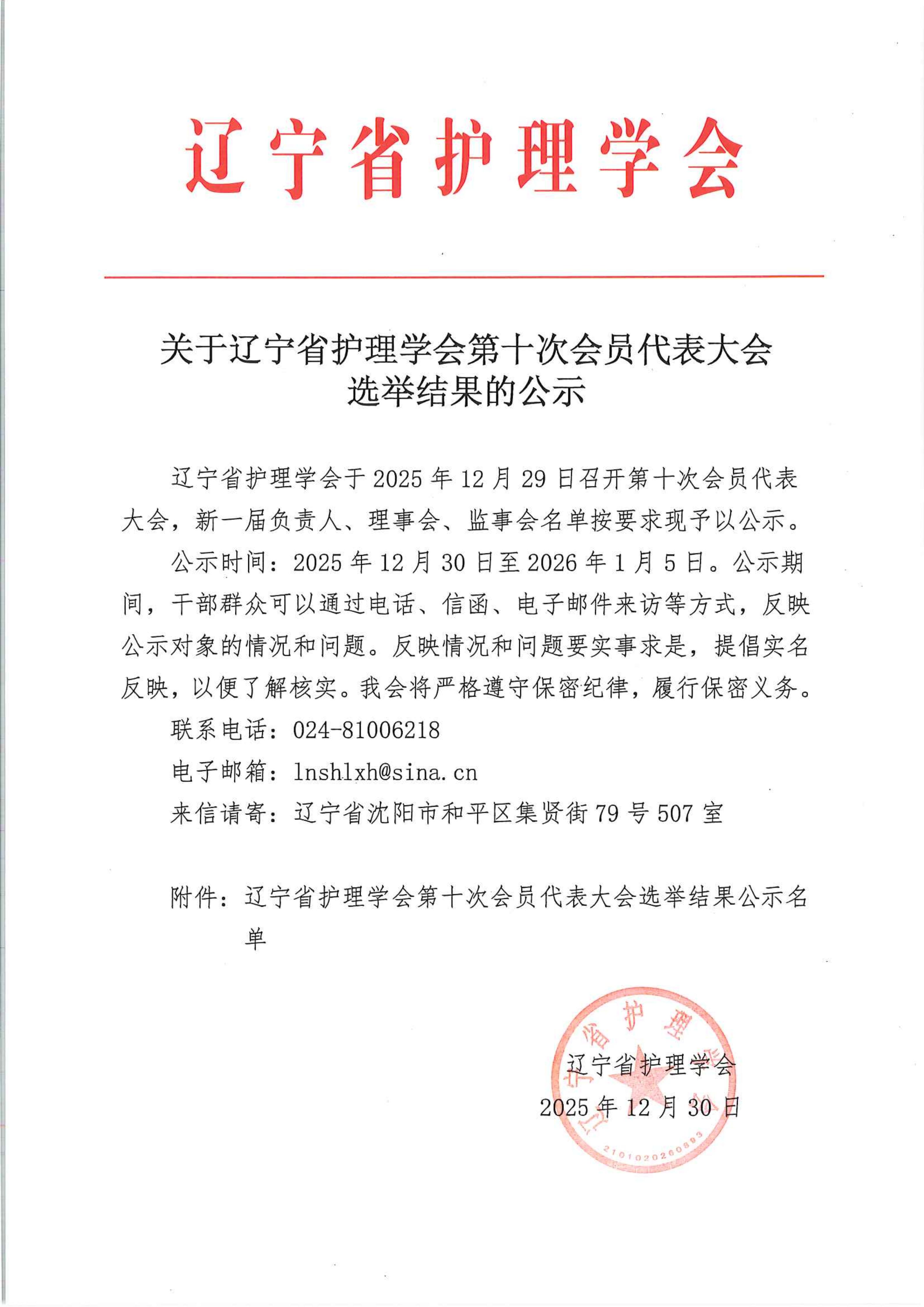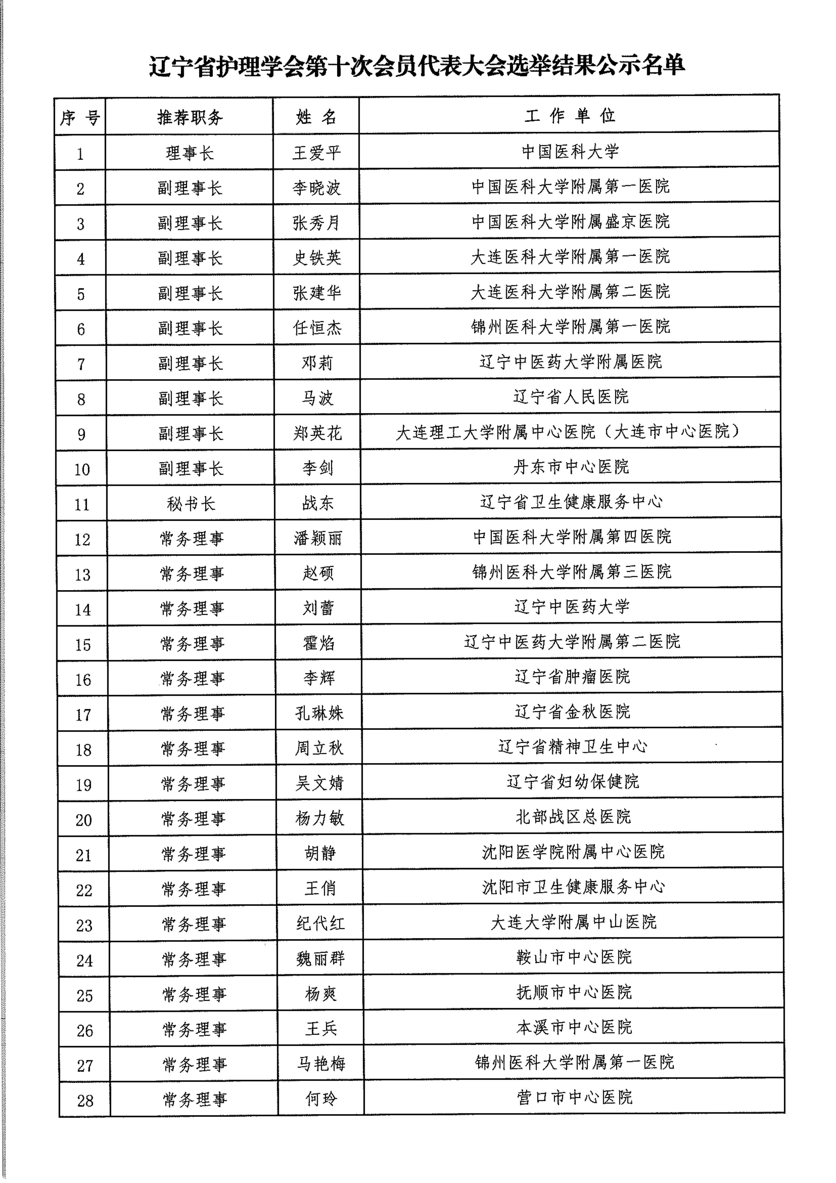 关于辽宁省护理学会第十次会员代表大会选举结果的公示