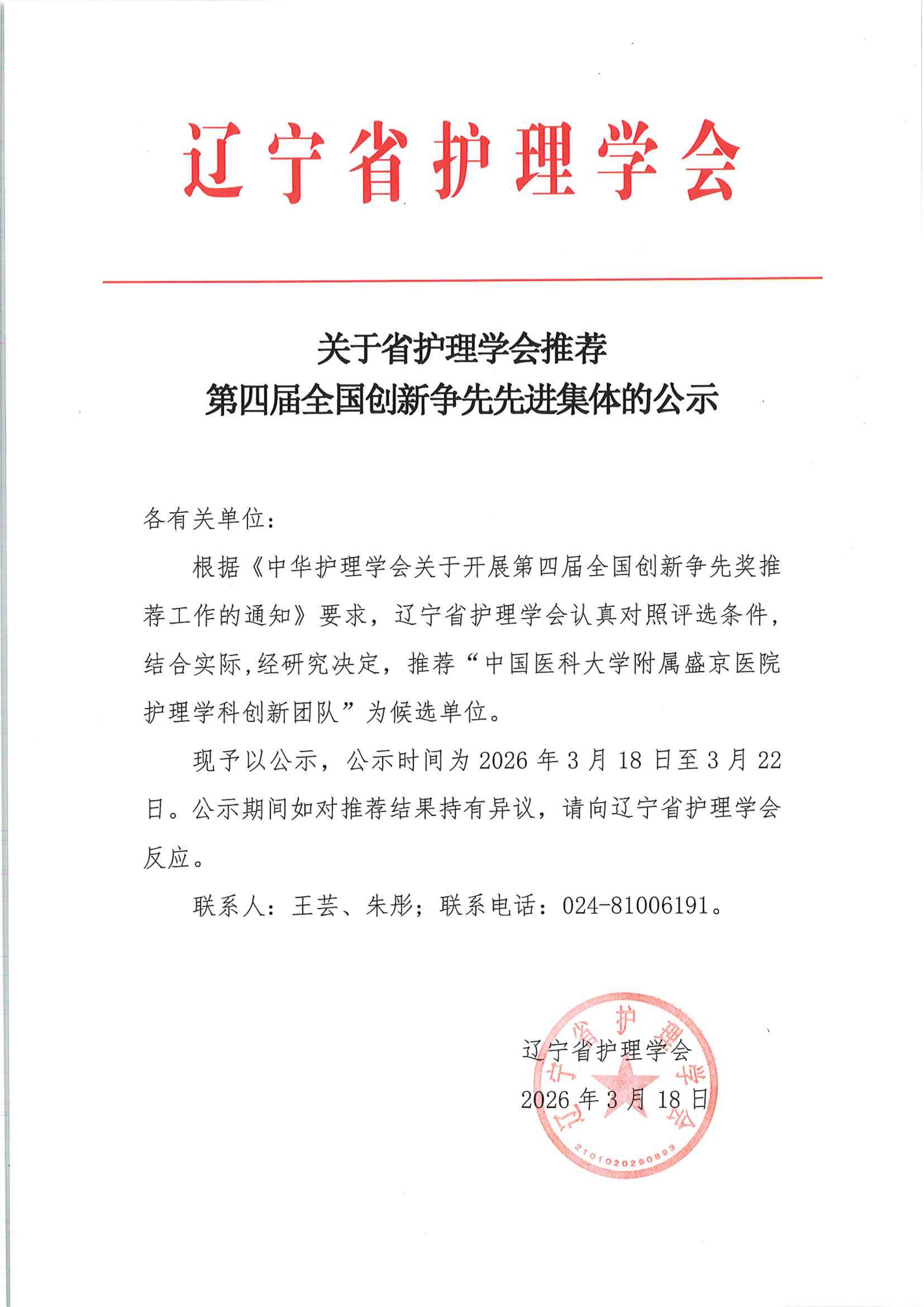 关于省护理学会体检第四届全国创新争先先进集体的公示